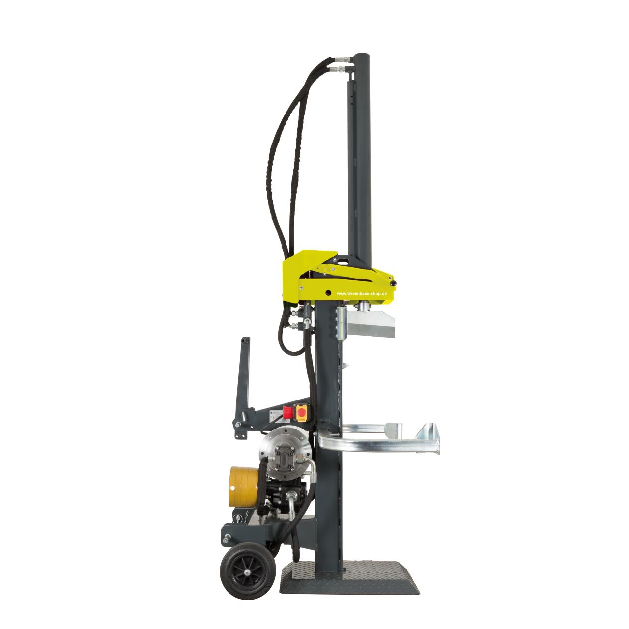 Greenbase Langholzspalter T-Serie. Professioneller Langholzspalter mit schnellem Rücklauf und einer großen, schweren Fußplatte für sicheren Stand. Er verfügt über einen 3-Punkt-Anschluss Kat. und II für Traktortransport, sowie einen absenkbaren Zylinder für Straßentransport. Eine Sicherheits-Zweihandbedienung sorgt für verletzungsfreies Arbeiten.